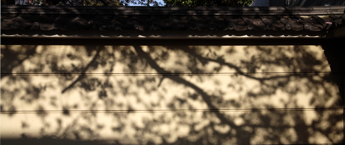 お寺の塀に写る木。